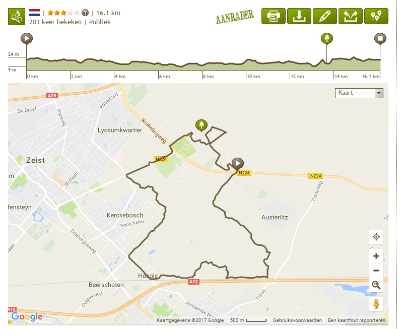 Een mooie fiets route van 16,1 km afstand. Je komt langs de Utrechtse Heuvelrug, dit is een zandrug die in de voorlaatste ijstijd werd opgestuwd door een gletsjer, zo een 150 000 jaar geleden. Toen kwam de poolijskap tot halverwege Nederland. Je kan de route starten op 1 km van de camping af.